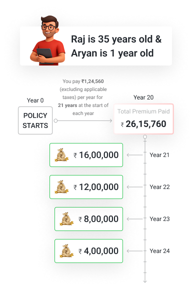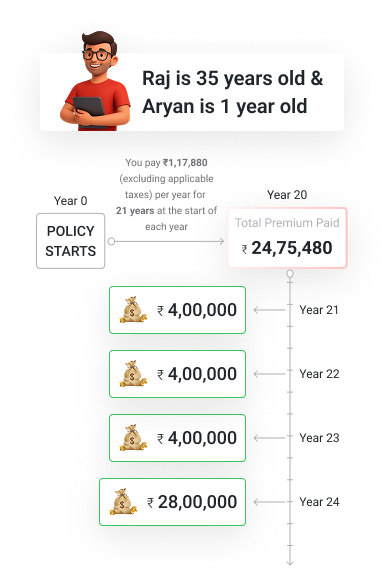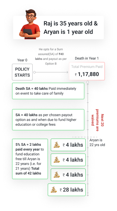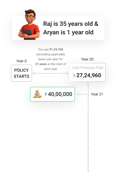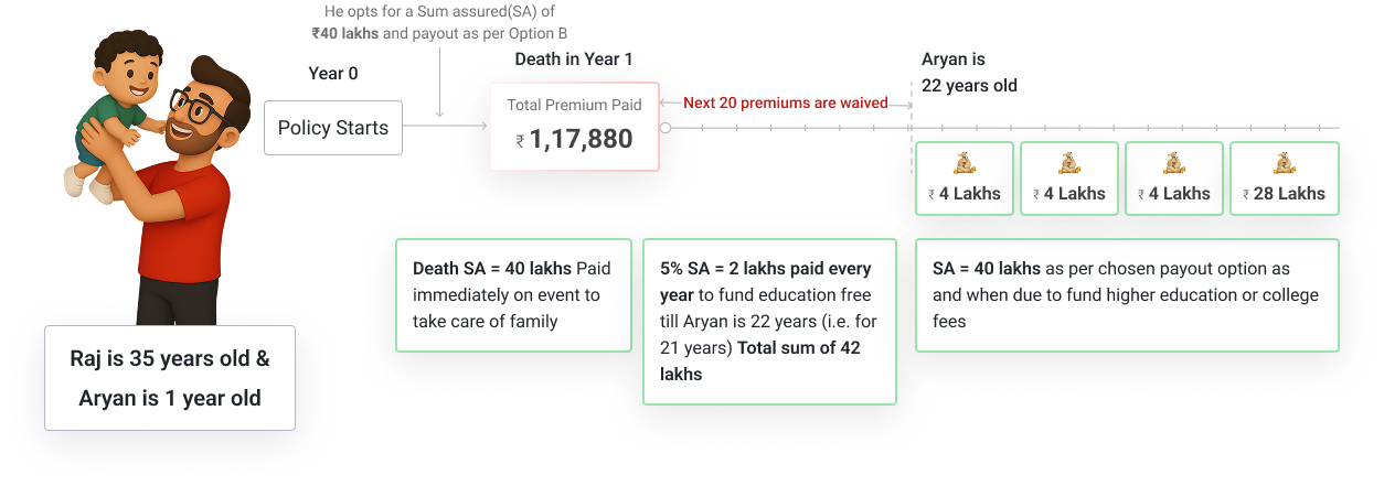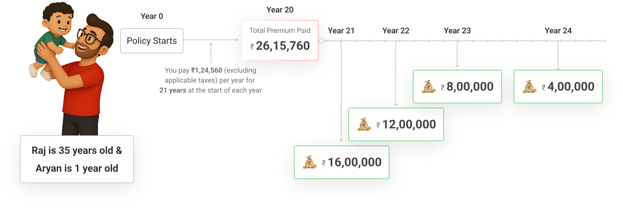 This plan offers guaranteed payouts timed for your child's higher education needs, plus life insurance coverage. If something happens to you, your child continues receiving annual payouts of 5% sum assured until maturity, ensuring uninterrupted education funding.