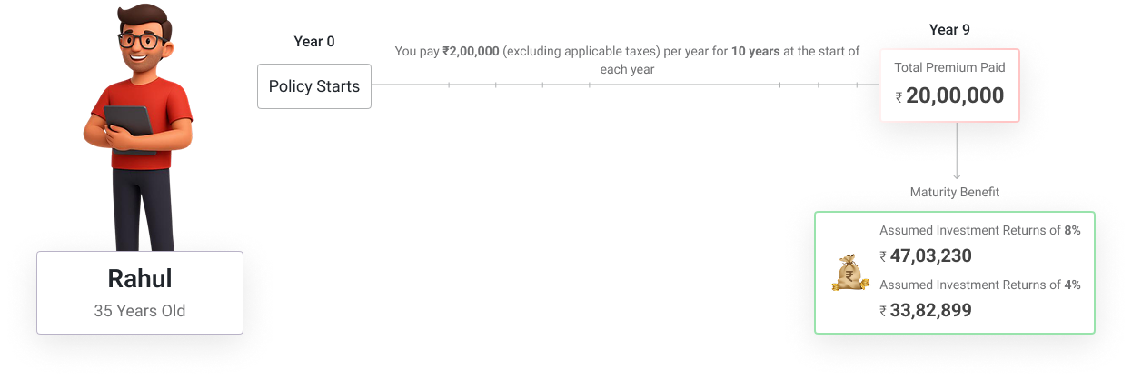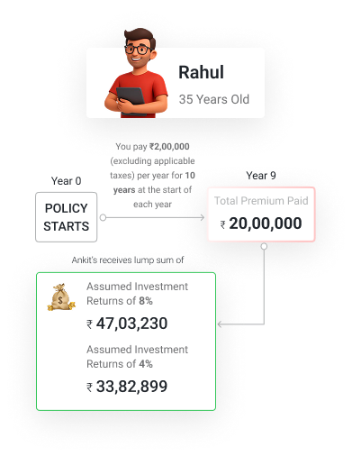 Rahul is 35 years old and has chosen to invest in Generali Central Bima Advantage Plus, with a Policy Term of 20 years, an annual premium of Rs. 2,00,000 for 20 years. His Death Benefit Multiple is 10 times and a Sum Assured (cover amount) of Rs. 20,00,000.